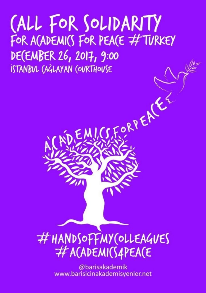 Call for Solidarity for Academics for Peace trials, December 26, 2017 Post published:24/12/2017 Post category:Academic freedom / International solidarity Call for Solidarity to the trial on Dec. 26, 2017 Read more articles Previous PostOpen letter from the international academic community in support of Academics for Peace Next PostBAK-Almanya Dayanışma Akademisi Başlıyor!