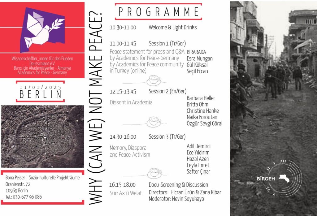 Barış için Akademisyenler – Almanya Derneği olarak, 28 Kasım – 4 Aralık 2024’te 2015-2016 yıllarında Türkiye’nin Kürt kentlerinde yaşanan sokağa çıkma yasakları, çatışmalar, zorunlu göç ve insan hakları ihlallerine dair toplumsal hafızayı koruma amacıyla Hamburg’ta gerçekleştirdiğimiz etkinliklerin devamını Berlin’de gerçekleştirmeyi planlıyoruz. 11 Ocak 2025’te barış imzasının 9. Yıldönümünde, sözümüzü tekrarlamayı ve güncel